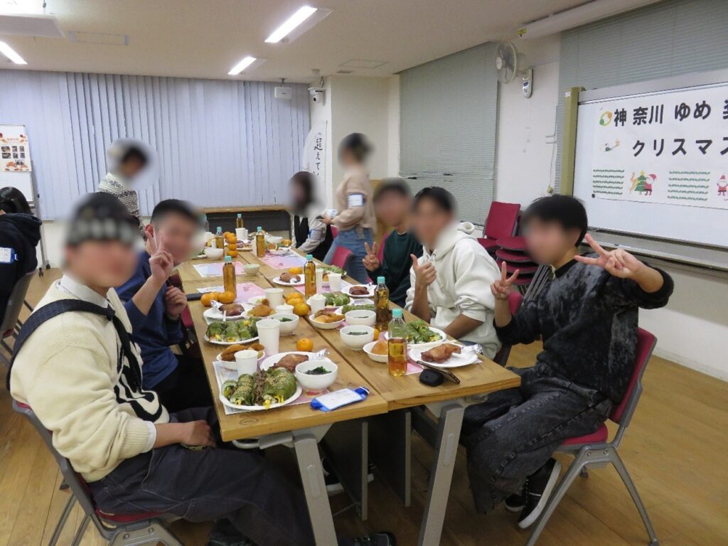 クリスマスに欠かせないチキン等、自分たちで作った料理を囲み、世代を超えた交流に花が咲きました。